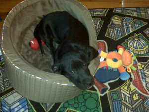 I'm sure you already know but he is just the sweetest thing we have ever seen! He loves to play with the boys and he keeps his toys all together in his bed! He is a good sleeper too! He happily goes in his crate at bedtime and sleeps through the night! Although it may have something to do with the boys keeping him going and he has met a few of our friends and their kids so he has been busy and he got tuckered out! He is very friendly and loves all of the kids he's met so far! We found that he loves to play fetch and a bowl of water doesn't stand a chance when he around! We are just getting to know his rhythms and the potty thing is going to take some time but he is smart and will figure it out soon! Our whole family is so excited to see just how he is going to blossom! My husband drives around a lot for work so he is planning on taking him along a couple days a week because he loves riding in the car! We are attaching some pictures so you can see how well the mange has cleared up! His coat is absolutely beautiful! He really is a good boy! We will send more pictures as time goes on so you can see his progress and maybe take a little pride in knowing that you were his "Angel in Georgia" that saved him and his siblings!!!! Thank you thank you a million times over!!!!